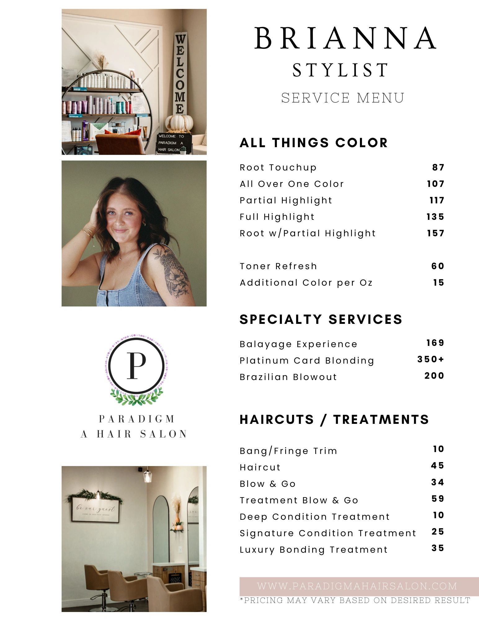Hi, I’m Bri! I’m a 22-year-old hairstylist with a passion for creating effortlessly beautiful, low-maintenance, lived-in hair. I believe hair should feel natural, easy to manage, and tailored to your lifestyle — not just how it looks in the salon chair, but how it grows with you. I’m currently mentoring under the amazing stylist Christina and have been loving every minute of it while gaining so much knowledge.